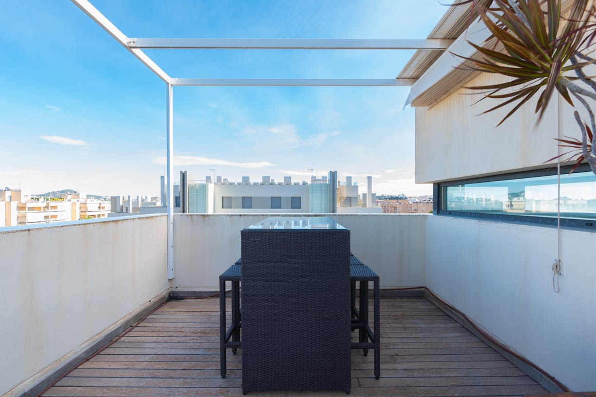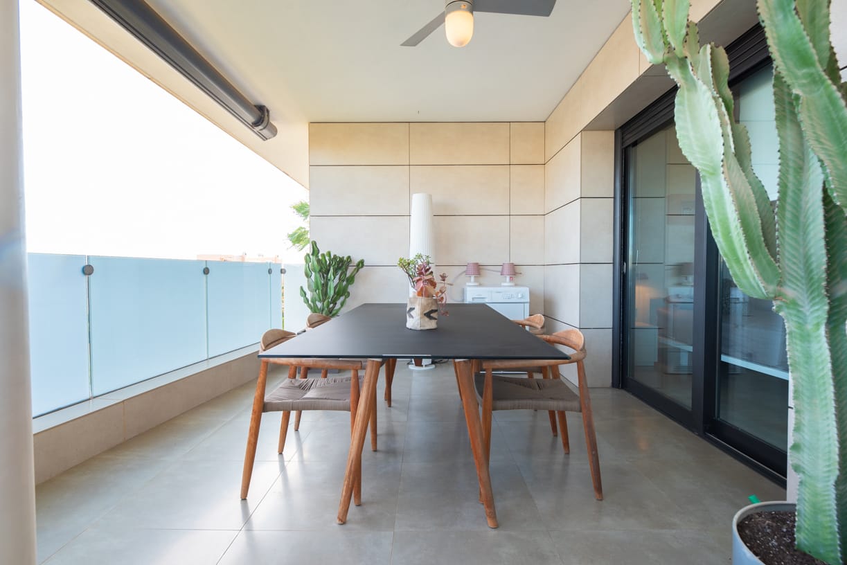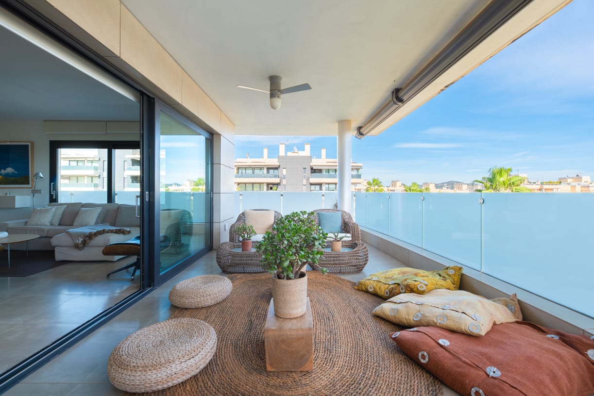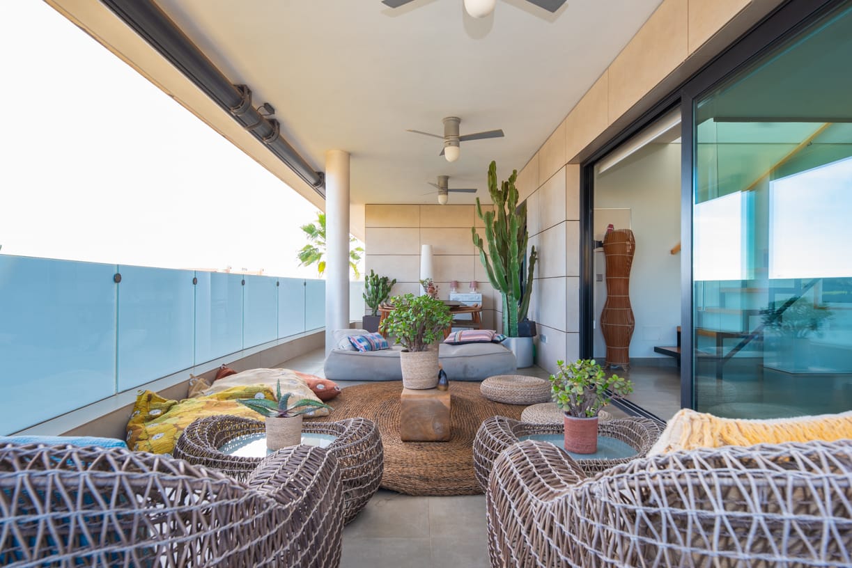 AUSSENBEREICHE Das Penthouse bietet großzügige Außenbereiche, einschließlich einer großen umlaufenden Terrasse mit Deckenventilatoren und Beleuchtung, möbliert mit einem Esstisch für sechs Personen und einer gemütlichen Chill-out-Zone – perfekt für Familien- und Freundestreffen.