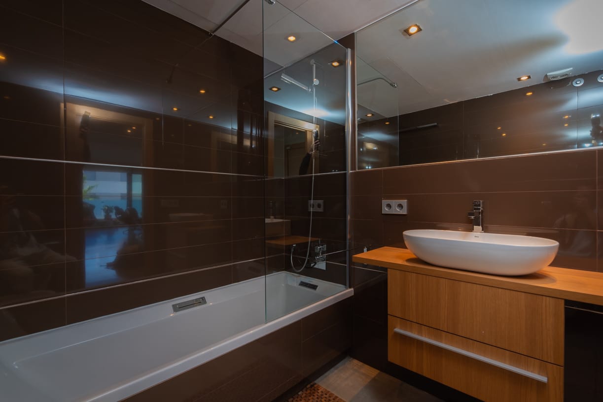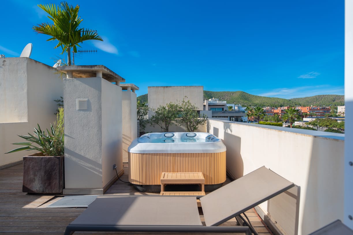 Zusätzlich gibt es eine private 92 m² große Dachterrasse mit Teakholzbelag, die einen kompletten Sonnenbereich mit Jacuzzi bietet und somit einen idealen Ort zum Entspannen darstellt. Die Dachterrasse ist mit Olivenbäumen, tropischen Pflanzen, einer Außendusche, Ambientebeleuchtung und einer großen einziehbaren Markise für zusätzlichen Komfort an sonnigen Tagen ausgestattet.