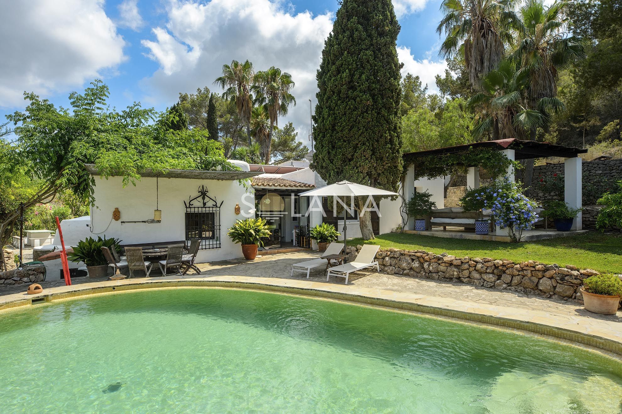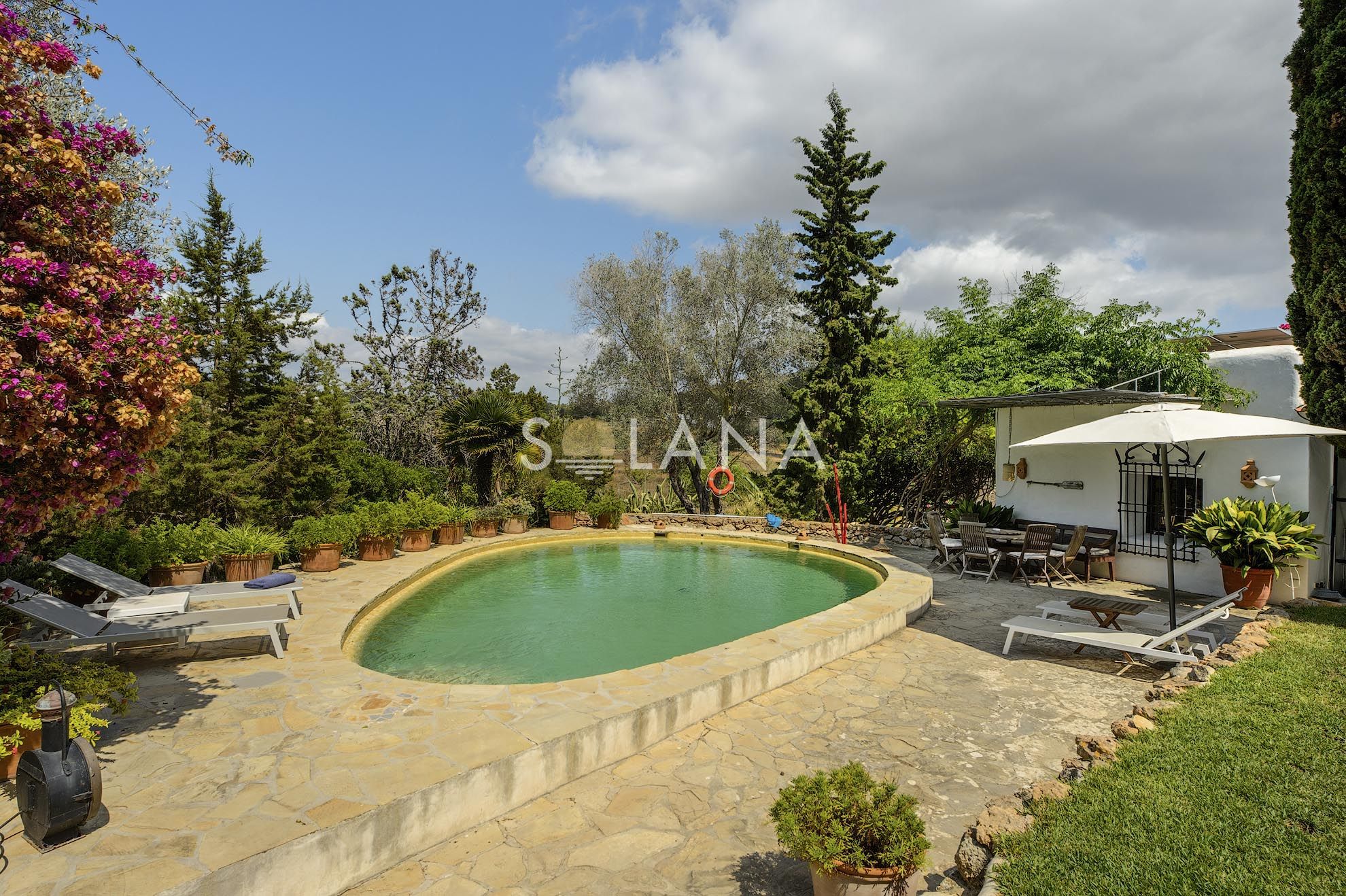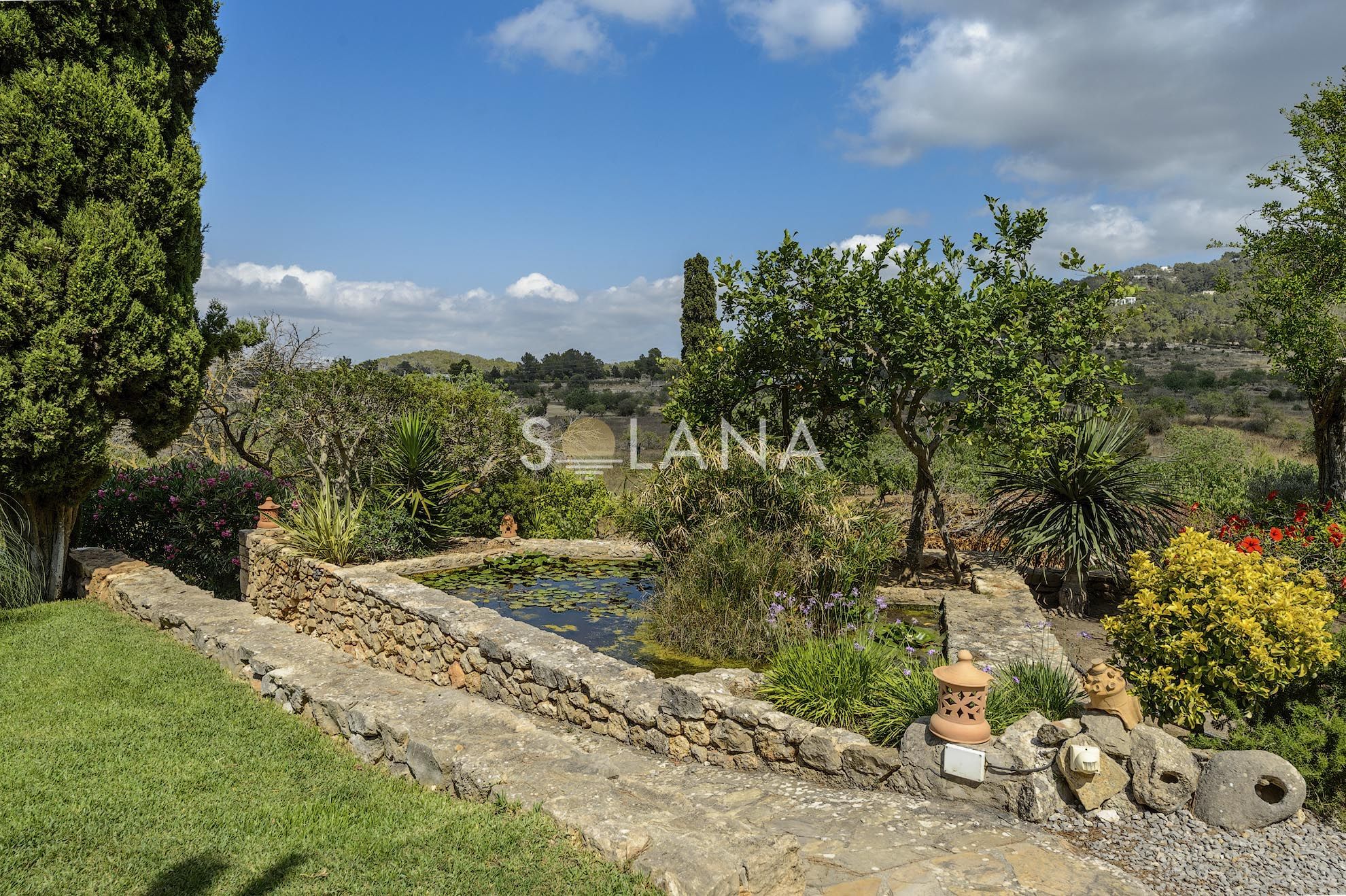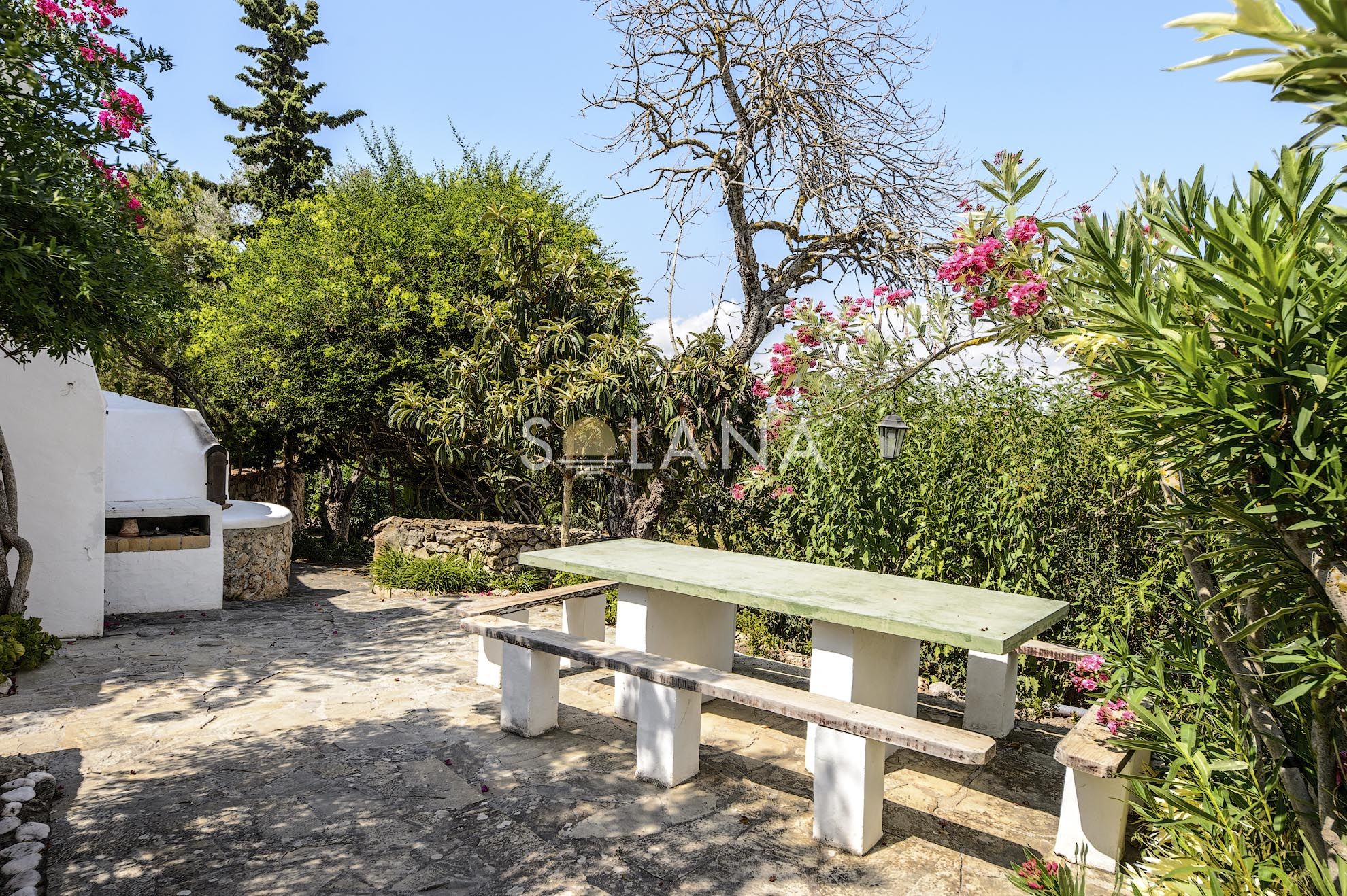 The exterior spaces are designed for Ibiza’s outdoor lifestyle. A circular 45 m² pool is surrounded by terraces, creating multiple zones for sunbathing and relaxation. A pergola provides shaded summer dining and lounge living, complemented by an outdoor shower and a barbecue/al fresco setup that makes entertaining simple. The Mediterranean garden—with mature trees, vibrant planting and a pond—adds a sense of privacy and calm that is increasingly rare close to village life.
