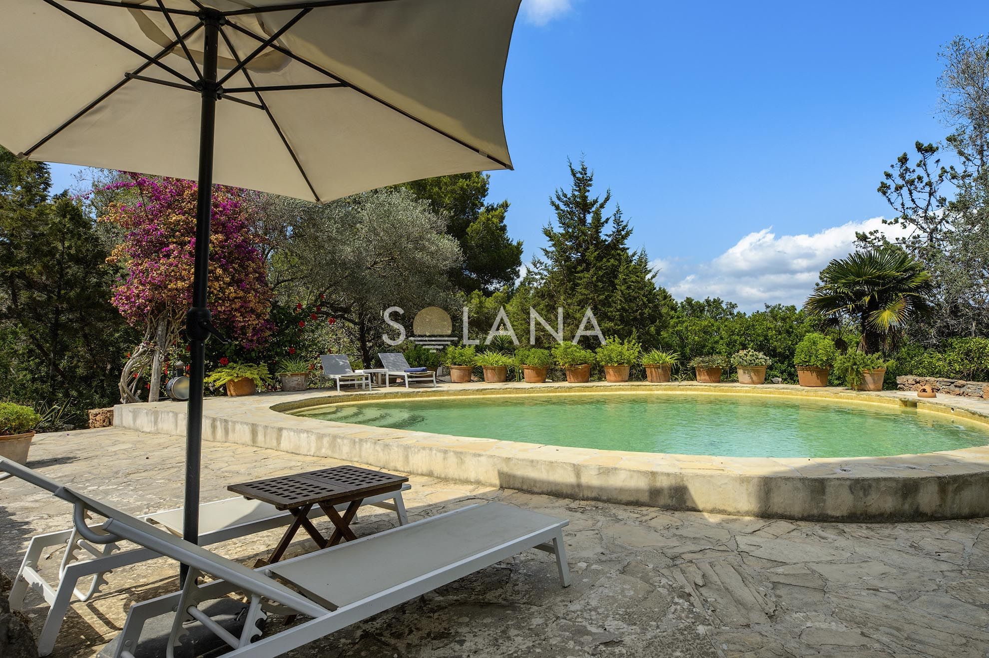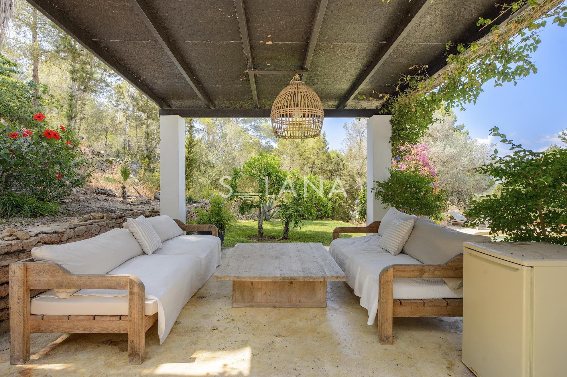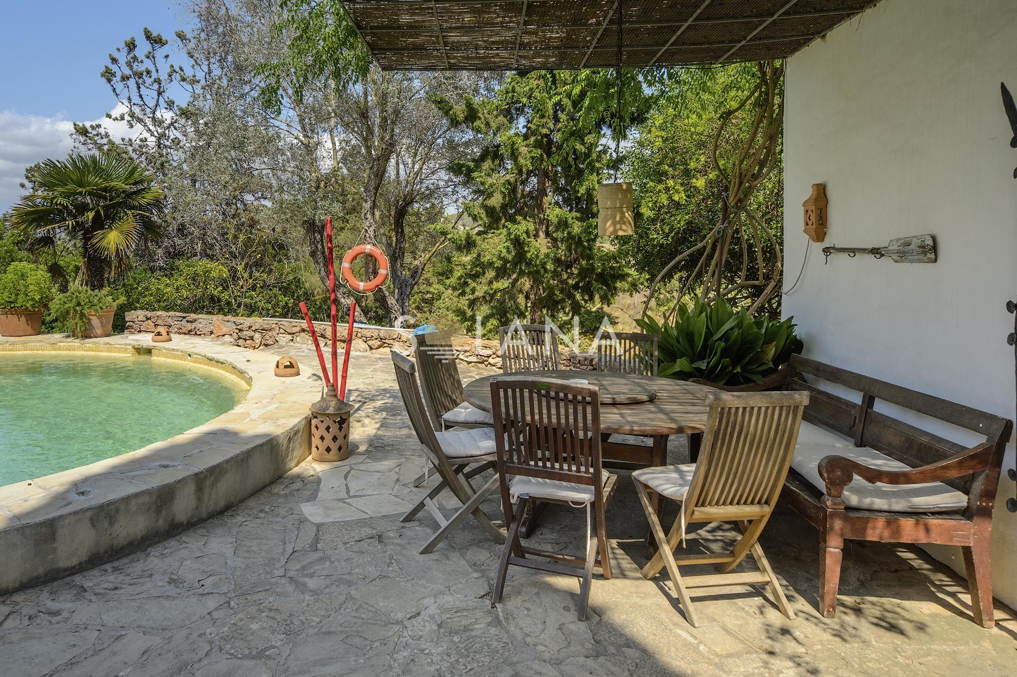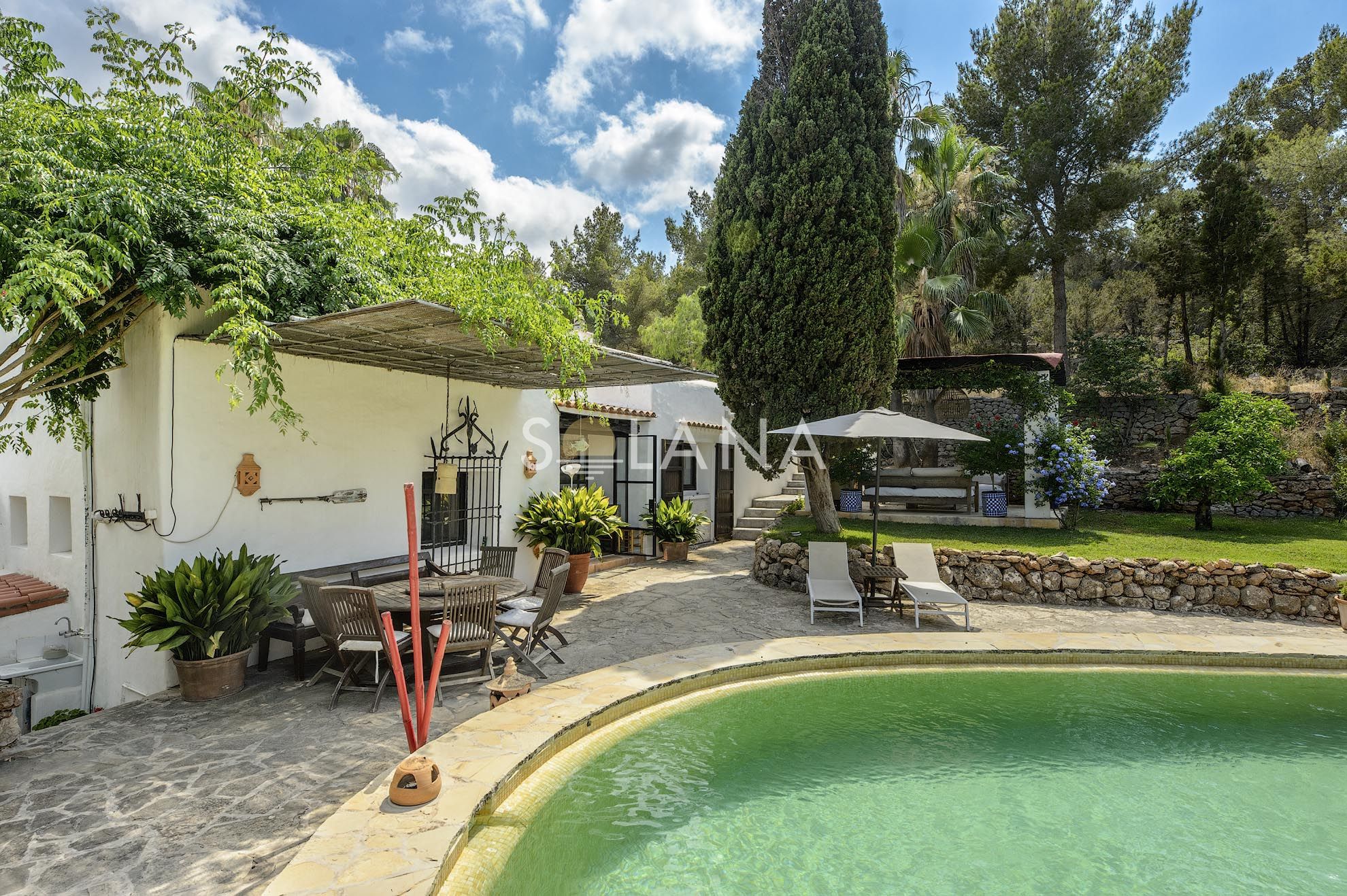 The exterior spaces are designed for Ibiza’s outdoor lifestyle. A circular 45 m² pool is surrounded by terraces, creating multiple zones for sunbathing and relaxation. A pergola provides shaded summer dining and lounge living, complemented by an outdoor shower and a barbecue/al fresco setup that makes entertaining simple. The Mediterranean garden—with mature trees, vibrant planting and a pond—adds a sense of privacy and calm that is increasingly rare close to village life.