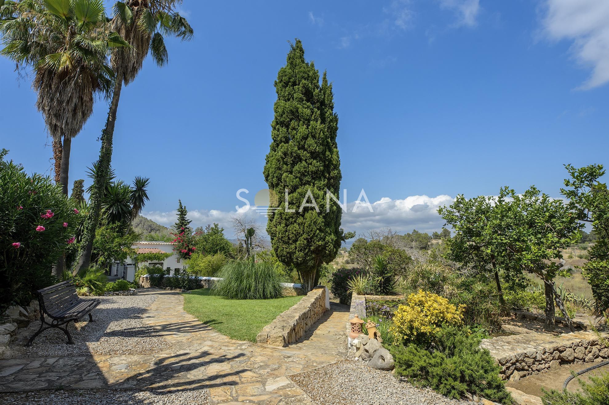 - Mediterranean garden with mature trees and lush vegetation